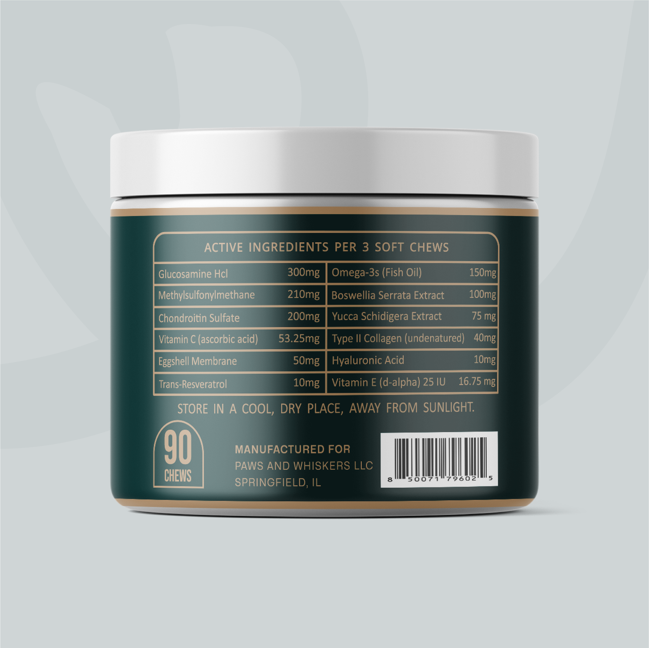 Vet-formulated soft chews with Glucosamine, MSM, Omega-3s, and Collagen to support joint mobility, flexibility, and comfort in dogs of all sizes.