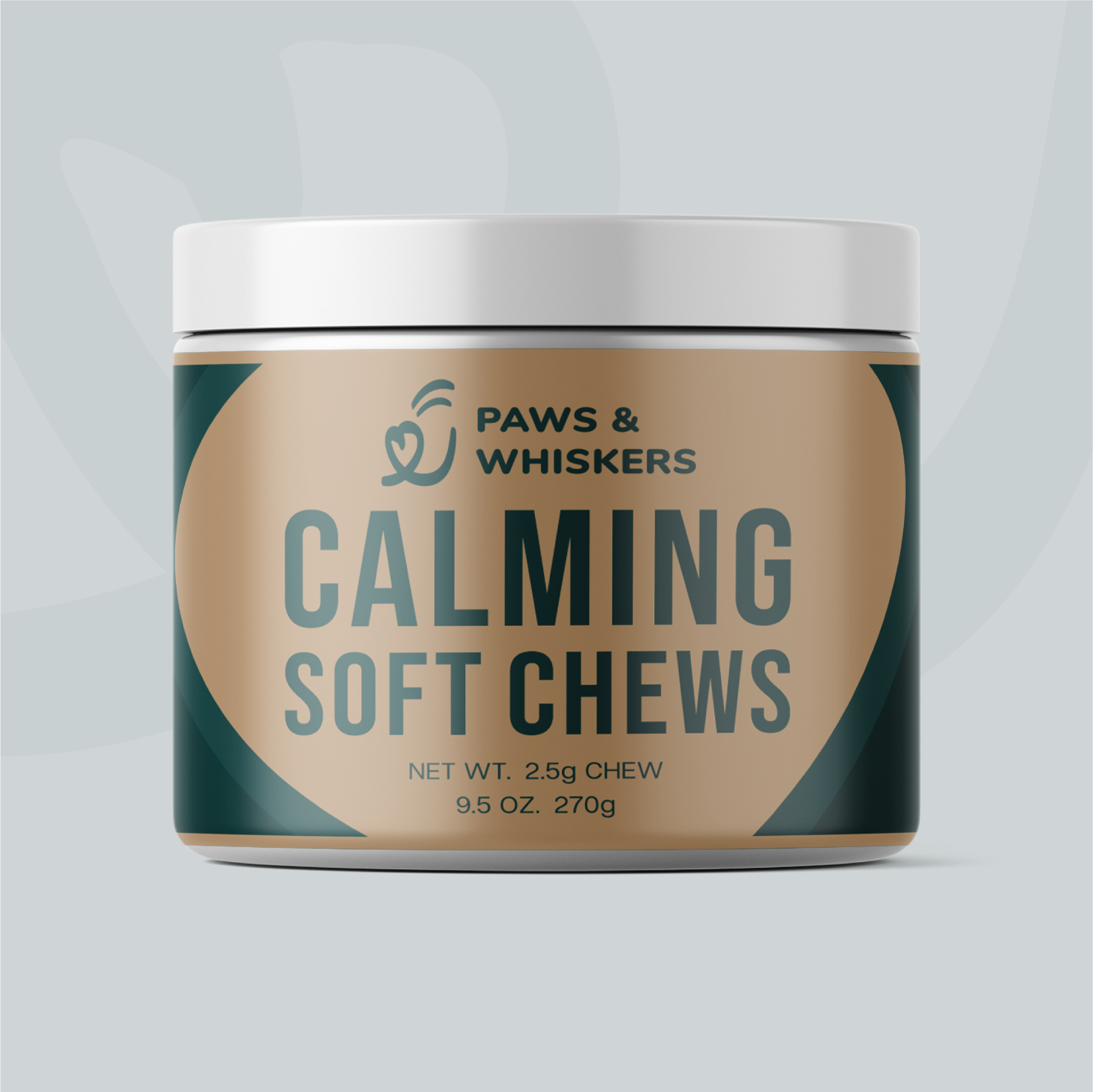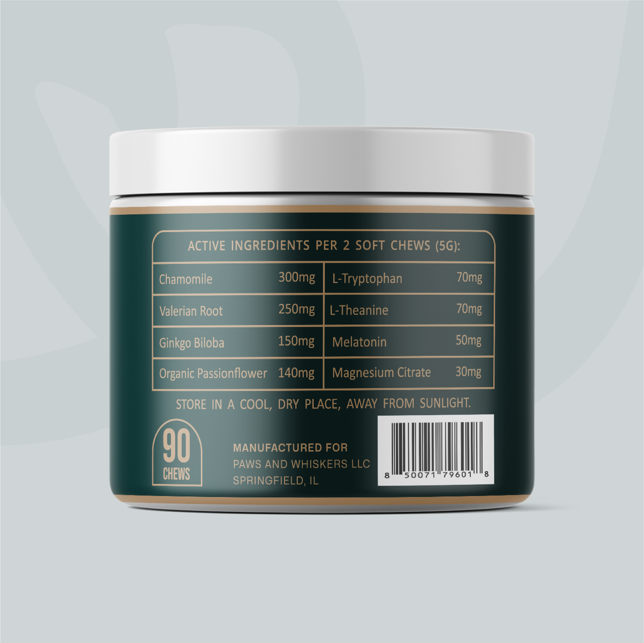 Natural calming soft chews with Chamomile, Valerian, L-Theanine, and Melatonin to ease anxiety, hyperactivity, and stress-related behaviors.