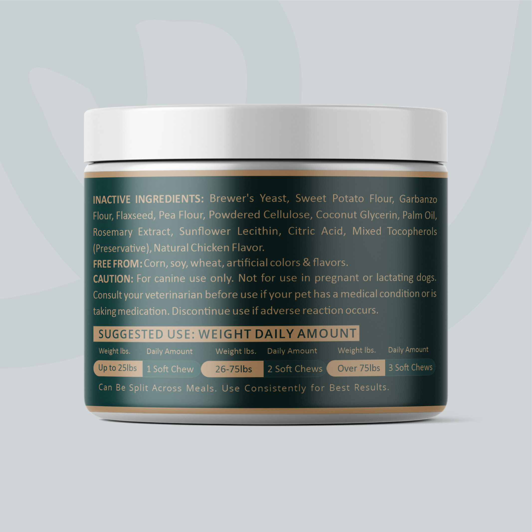 Professional Recommendation: Dosing calculations based on 90 chews per container. Individual pet requirements may vary based on age, health status, and specific conditions. Always consult with a licensed veterinarian before introducing new supplements to your pet's routine, especially if your pet has existing health conditions or is taking other medications.
