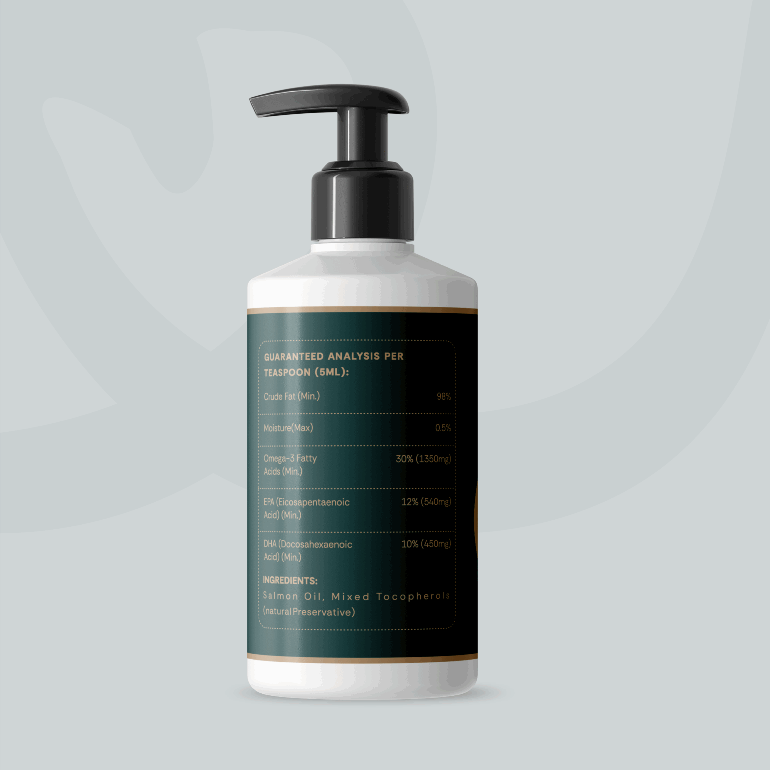 Cold-pressed Wild Alaskan Salmon Oil rich in Omega-3s to support coat health, joint function, heart wellness, and inflammation control.
